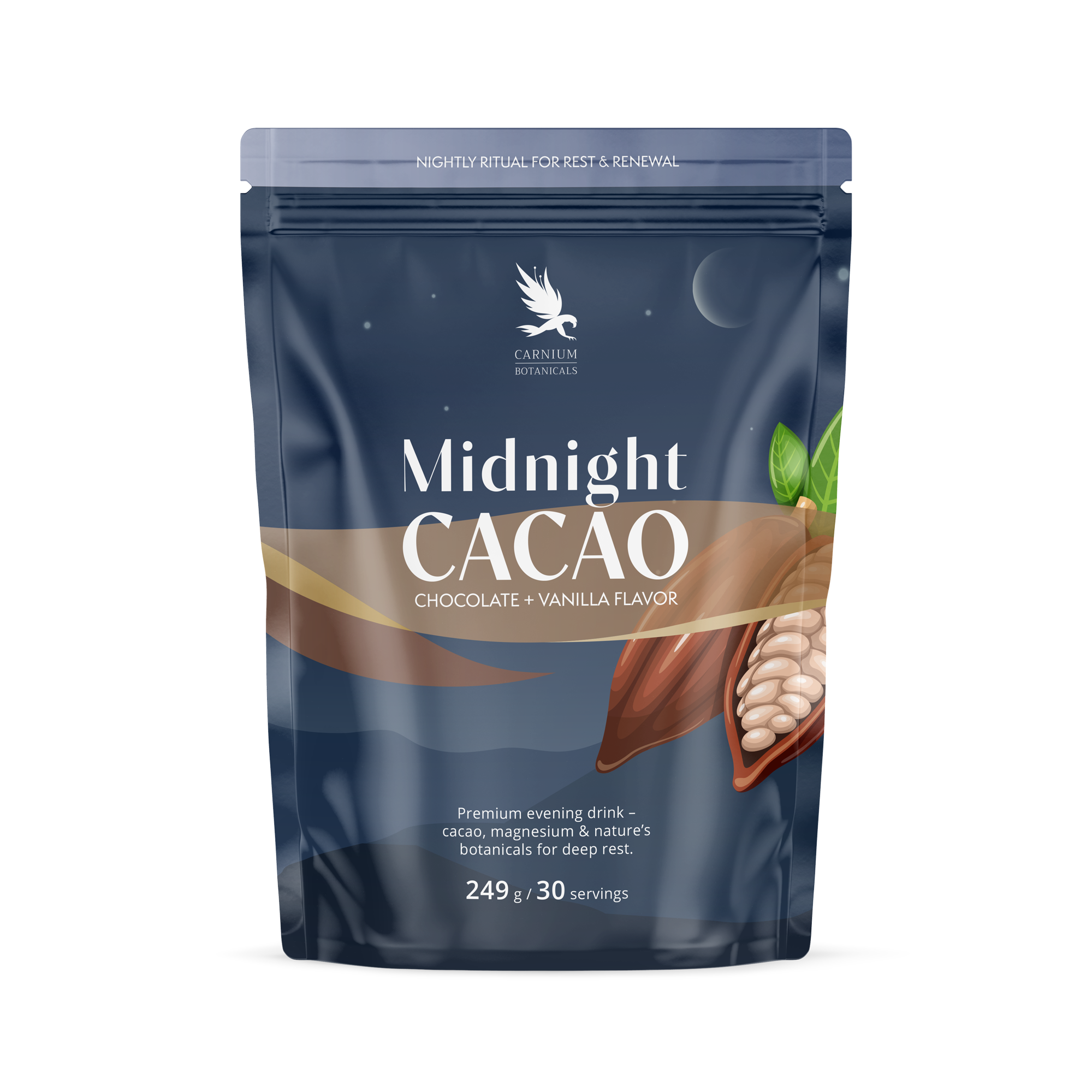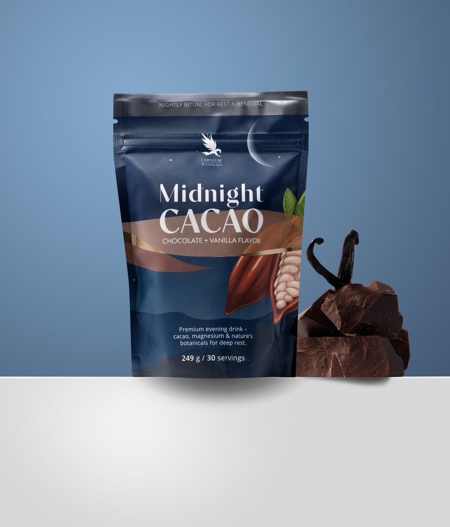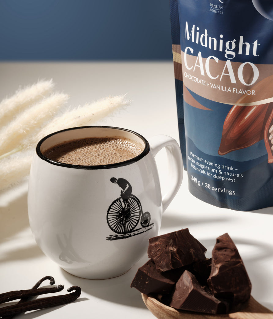 Midnight Cacao je prémiový večerní nápoj, který krásně zapadne do vaší relaxační rutiny. Je určen pro všechny, kteří touží po příjemném zakončení dne a chytré podpoře při přechodu z denního rytmu k odpočinku.